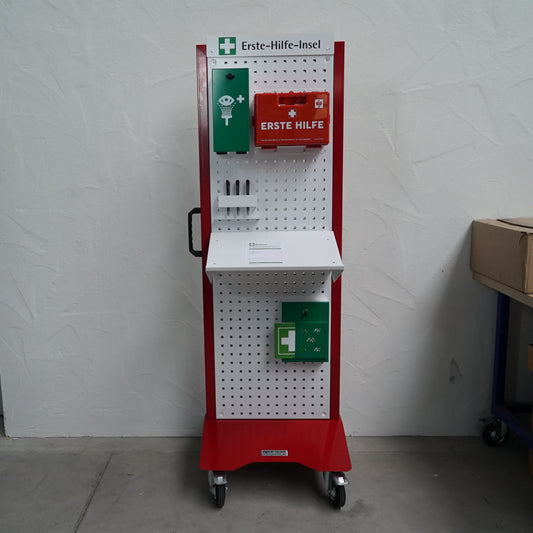Mit der Erste-Hilfe-Insel ist schnelle Hilfe im Notfall garantiert. Dank der übersichtlichen Anordnung aller notwendigen Materialien sind diese sofort griffbereit und zentral im Betrieb verfügbar. Der modulare Aufbau ermöglicht eine individuelle Ausstattung nach Bedarf und sorgt für maximale Effizienz in jeder Situation.